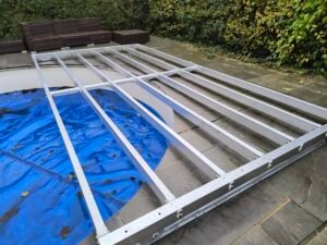 The aluminium sheets in the bottom of the pool cover has two main purposes. One is to ensure an enclosed cover, and not having rain and debrees into the pool, and the other one is to act as a barrier towards to pool water, and thereby minimizing the water evaporation and heat loss.